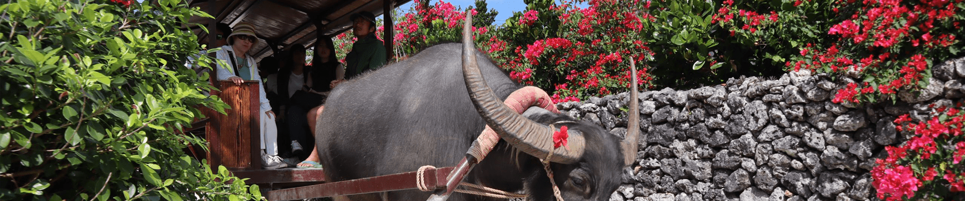 沖縄の原風景、赤瓦屋根の街並みの中を水牛車にゆられてのんびり観光
